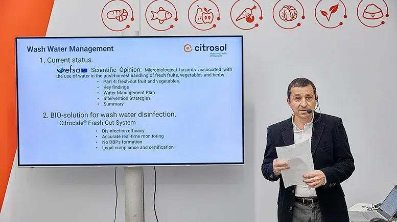 En el Foro Técnico de higiene, calidad y automatización, el Dr. Martín Mottura, de Citrosol, impartió la ponencia “Manejo del agua y seguridad alimentaria en operaciones de lavado postcosecha”, en la que analizó la situación actual del manejo del agua en los procesos de lavado en la industria de la IV Gama a partir de los resultados publicados recientemente por la EFSA (Agencia Europea de Seguridad Alimentaria). Durante su intervención, Mottura explicó cómo el sistema integral Citrocide® Fresh-Cut, desarrollado por Citrosol, garantiza un lavado higiénico de frutas y hortalizas mínimamente procesadas, aumentando la seguridad alimentaria de forma eficiente y sostenible.
