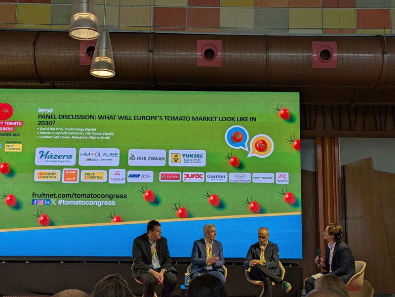 Tras su intervenciรณn, Lambert se uniรณ a la mesa redonda โยฟCรณmo serรก el mercado europeo del tomate en 2030?โ, donde estuvo acompaรฑado por el consultor y socio director en Freshtrategy, David del Pino, y el responsable de Proyectos de Cadena de Valor de Rijk Zwaan, Alberto Cuadrado.