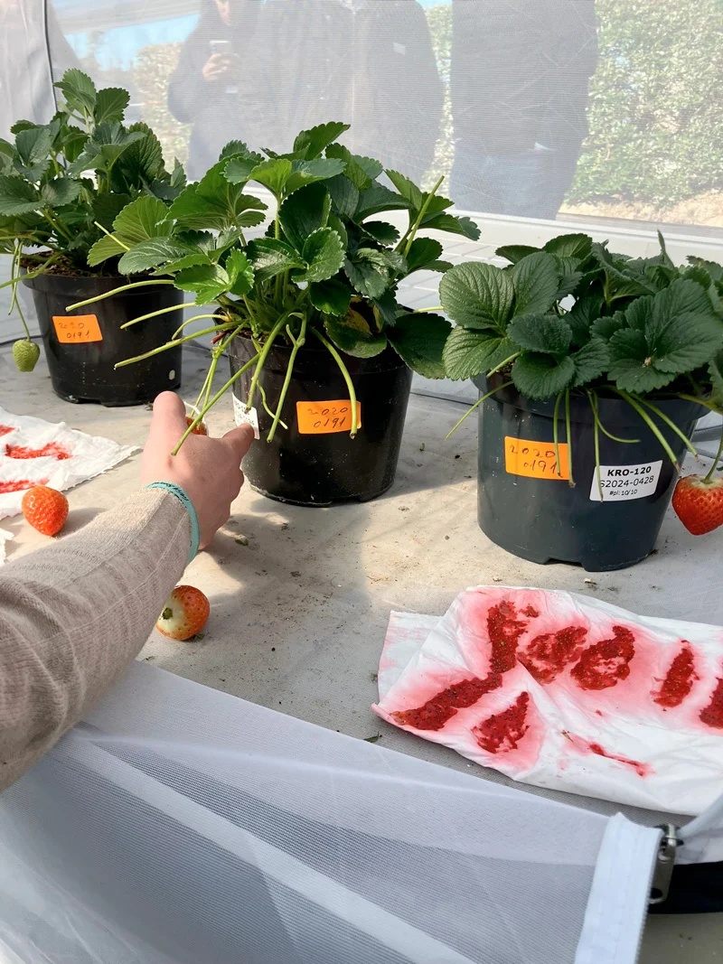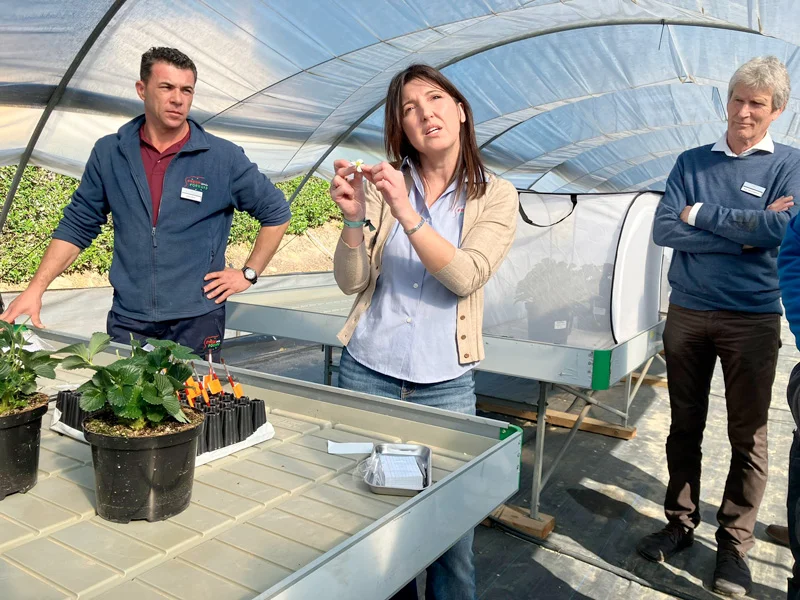 Durante la visita, en primer lugar, Gema Dรญaz, Assistant Breeder y Bert Meulenbroek, manager breeding de Fresh Forward, mostraron los pasos que siguen para realizar los cruzamientos de variedades en la bรบsqueda de la mejor selecciรณn de fresa. En primer lugar, realizan un muestreo de las hojas de unas 25.000 plantas que mandan al laboratorio de Holanda para realizar un diagnรณstico. Posteriormente, Dรญaz explicรณ cรณmo el polen de las anteras (parte masculina) debe llegar a los estigmas (parte femenina) de la flor, a travรฉs de abejas, moscas o, aunque son autofรฉrtiles, mediante polinizaciรณn manual y controlados en insect proof. Asรญ, se realizan miles de cruzamientos para obtener caracterรญsticas que mejoren determinados aspectos de la variedad. Cuando crezca el fruto, se recolecta la semilla y se manda a germinar.