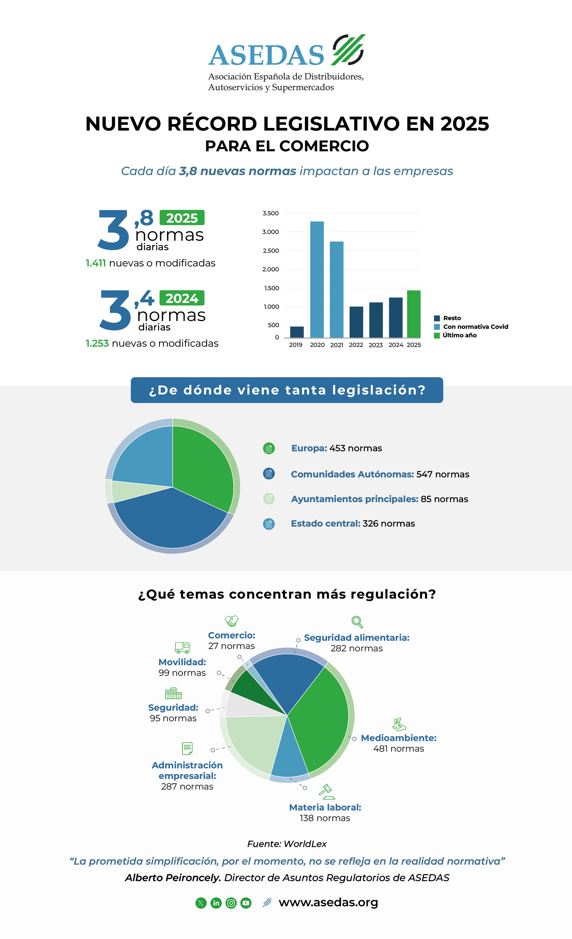 Durante 2025 se aprobaron o modificaron 1.411 textos normativos (leyes, reglamentos u otro tipo de normas jurídicas de distinto signo) *, lo que significa que cualquier comercio tuvo que conocer y ejecutar 3,8 nuevas normas cada día. De este modo, se marca un nuevo récord en la presión normativa, que no deja de crecer desde el año 2022 -desde el año 2020, si incluimos la situación excepcional derivada de la pandemia de la Covid-.
