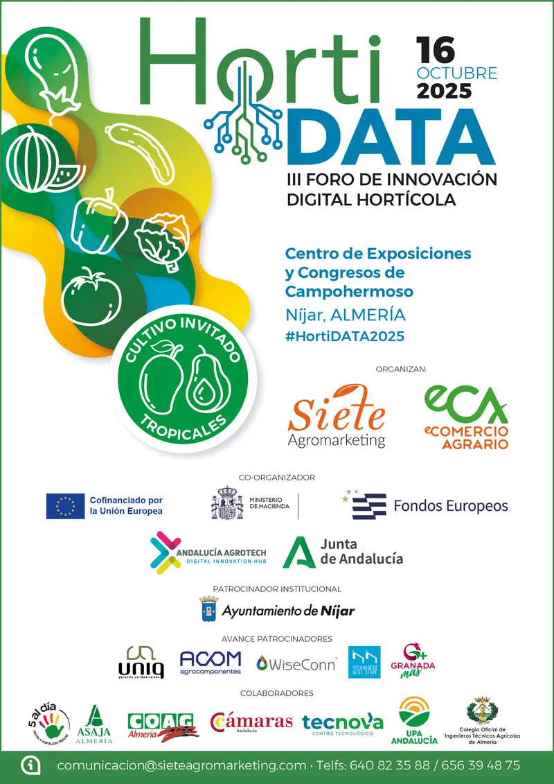 El evento, que estará presentado y moderado por José Antonio Arcos Sánchez, periodista de El Agro Auténtico; y José Esteban Ruiz Álvarez, periodista y responsable de edición en Siete Agromarketing, se celebrará el próximo jueves 16 de octubre en el Centro de Exposiciones y Congresos de Campohermoso en Níjar (Almería). Está organizado por Siete Agromarketing y eComercio Agrario y co-organizado por Andalucía Agrotech DIH, liderado por la Consejería de Agricultura, Pesca, Agua y Desarrollo Rural, que está cofinanciado por el Programa Fondos Europeos FEDER 2021-2027. Además, cuenta con el apoyo institucional del Ayuntamiento de Níjar. Todas estas entidades comparten una misma visión: apostar por el desarrollo tecnológico y la digitalización de la agricultura, impulsando así un modelo más competitivo, sostenible e innovador.