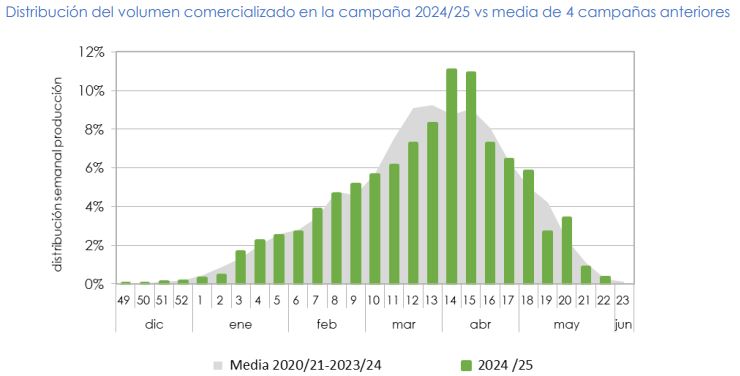 Por estas fechas, lo habitual es que el volumen esperado en la campaña roza el 97%. No obstante, la curva de distribución de los volúmenes comercializados en la campaña actual va a diferir de la habitual, al haberse acentuado la cosecha en el mes de abril.