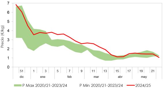 Los precios semanales se han colocado casi siempre por encima de los precios medios del periodo comprendido entre 2020/21-2023/24, o muy por encima de los máximos durante los meses de febrero y marzo.