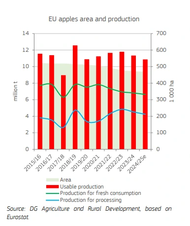 Se estima que la producción de manzanas de la UE en 2024/25 disminuirá un 4% hasta alcanzar los 10,9 millones de toneladas (-5% en comparación con la media de los últimos cinco años) y alcanzará el nivel más bajo desde 2017/18. El descenso se debe a las condiciones meteorológicas adversas, especialmente en Polonia (-13% interanual), que representa alrededor de un tercio de la producción total de la UE. Otros países también experimentaron importantes descensos en la producción, siendo República Checa (-63%) el más afectado.