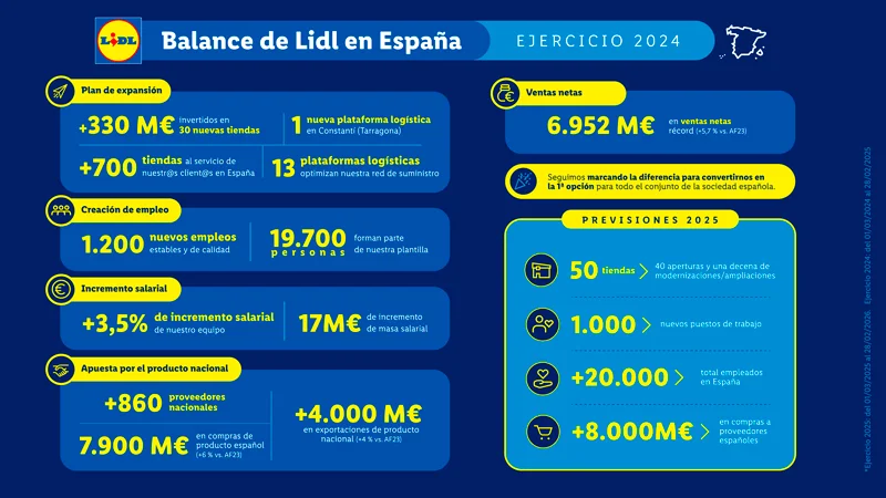 - Lidl refuerza su compromiso con el empleo de calidad al crear 1.200 nuevos puestos de trabajo en 2024, alcanzando una plantilla de unas 19.700 personas en España, junto con una mejora salarial del 3,5%.