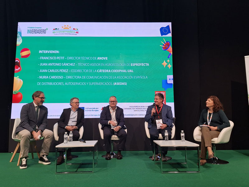 El programa del Congreso se ha estructurado en torno a tres grandes bloques, mostrando el potencial de los invernaderos solares del Sur de Europa. La mesa redonda โInvernaderos solares: sostenibilidad y soberanรญa alimentaria para Europaโ, moderada por el periodista David Baรฑos, ha contado con la participaciรณn del director tรฉcnico de la Asociaciรณn Nacional de Obtentores Vegetales -ANOVE-, Francisco Petit; el tรฉcnico asesor de la Consultorรญa Agroalimentaria EsProyecta, Juan Antonio Sรกnchez; el codirector de la Cรกtedra de la Asociaciรณn de Organizaciones de Productores de Frutas y Hortalizas de Almerรญa y de la Universidad de Almerรญa, COEXPHAL-UAL, Juan Carlos Pรฉrez y la directora de comunicaciรณn de la Asociaciรณn Espaรฑola de Distribuidores, Autoservicios y Supermercados -ASEDAS-, Nuria Cardoso.