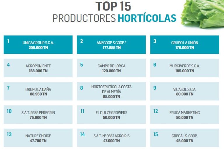 La cooperativa almeriense Unica Group S.C.A. se sitúa en la primera posición del Top 15 de productores hortícolas en España, alcanzando un volumen comercializado de 200.000 toneladas durante la última campaña.