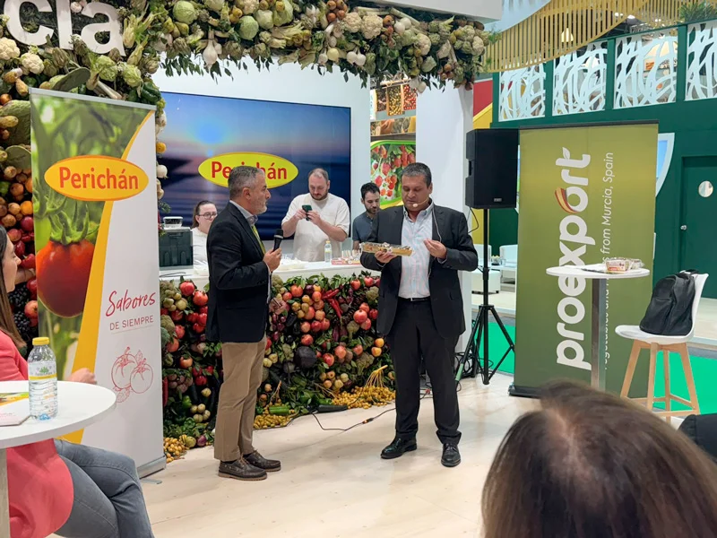 La Región de Murcia cuenta con 1.960 hectáreas dedicada al tomate, en las que se producen más de 200.000 toneladas al año de este producto. Estas cifras muestran la relevancia para la Comunidad de una fruta que se erigió como producto estrella de Fruit Attraction 2025 y que Proexport ha promocionado a través de iniciativas como el showcooking en el que ha participado Perichán.