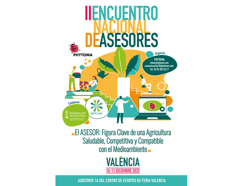 El II Encuentro Nacional de Asesores, organizado por Phytoma con la colaboración de la Conselleria de Agricultura, Agua, Ganadería y Pesca de la Generalitat Valenciana, ya cuenta con el programa definitivo. El Centro de Eventos de Feria Valencia reunirá el 10 y 11 de diciembre a los profesionales especializados en el asesoramiento agronómico y a la gestión integrada de plagas.