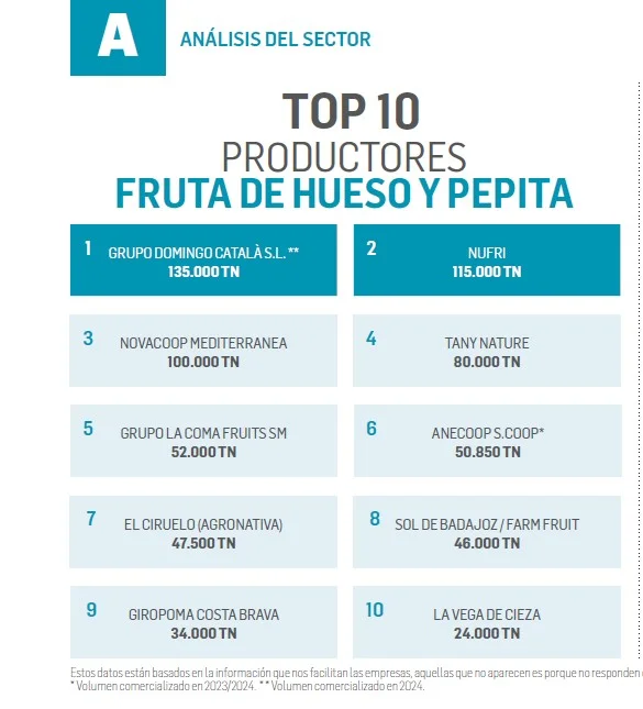 Uno de los rasgos claves del sector es la concentración empresarial. De las 684.000 toneladas producidas por las diez mayores compañías de fruta de hueso y pepita en la pasada campaña, el 64% corresponde a las empresas del Top 4 de este ranking. Nufri se encuentra en el segundo puesto con 115.000 Tn; Novacoop Mediterránea, en el tercero, con 100.000 Tn; y Tany Nature, con 80.000 Tn, cierra este bloque.