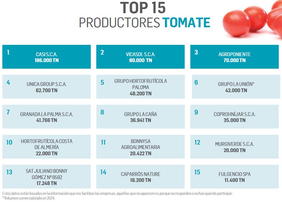 Los tres primeros operadores del top, CASI, Vicasol y Agroponiente, concentran cerca de la mitad del volumen representado, lo que pone de manifiesto un alto grado de concentración en la cúspide del sector del tomate.