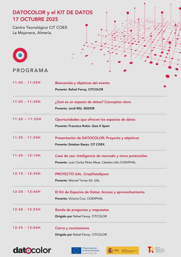 El programa se completarรก con casos de uso de los espacios de datos como Inteligencia de mercado o el CropDataSpaceย de la Universidad de Almerรญa, asรญ como el acceso y aprovechamiento de los mismos en el caso de DATOCOLOR.